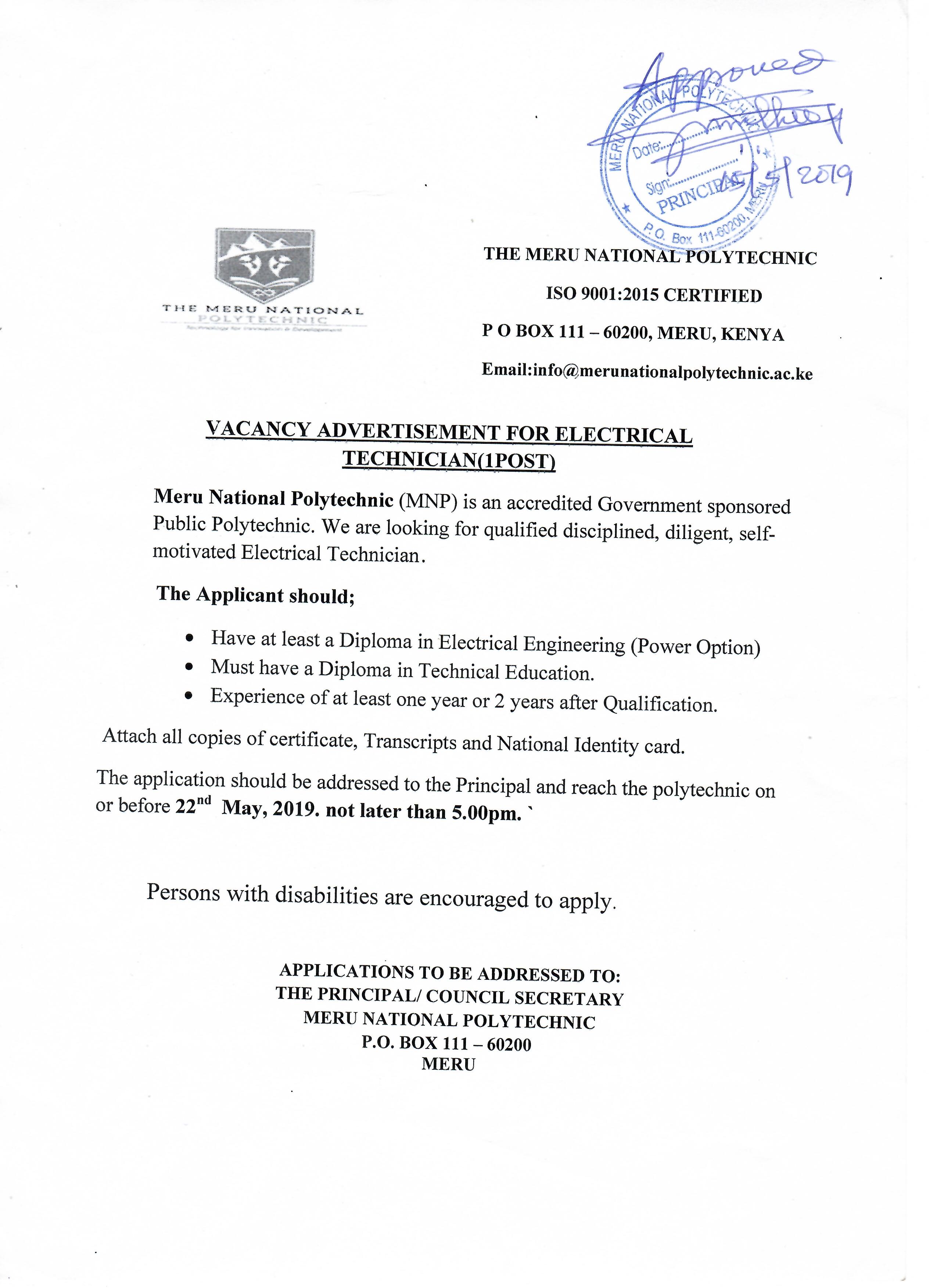 VACANCY ADVERTISEMENT FOR ELECTRICAL TECHNICIAN (1 POST)